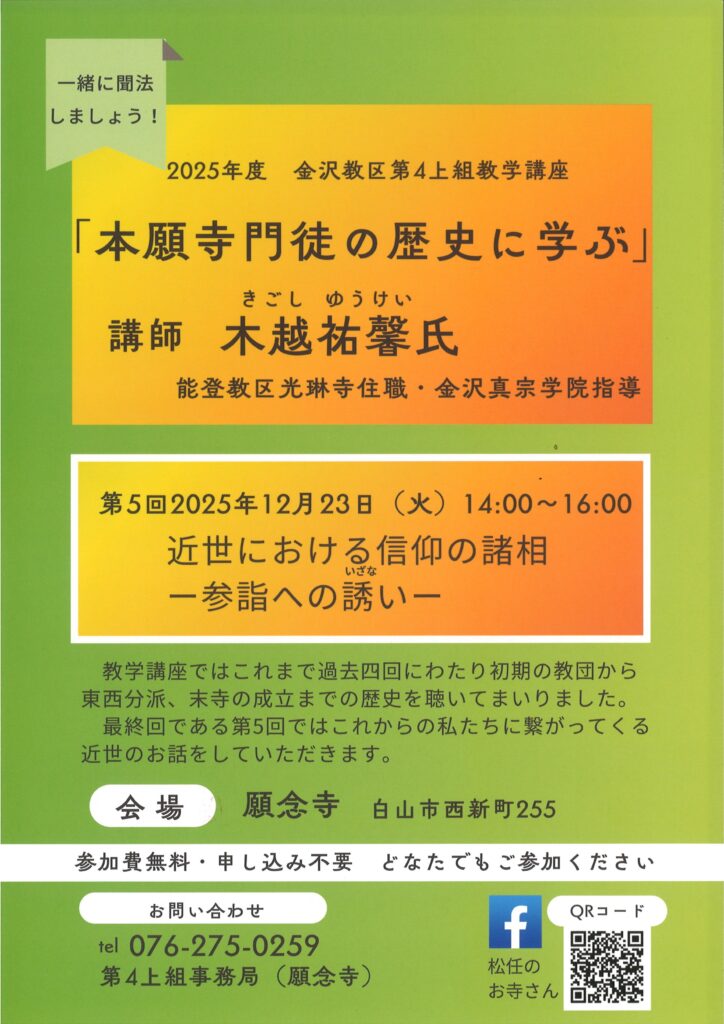 金沢教区第4上組教学講座「本願寺門徒の歴史に学ぶ」第5回が12月23日(火)午後2時より開催されます。『近世における信仰の諸相ー参詣への誘(いざな)いー』の講題で能登教区光琳寺住職・金沢真宗学院指導 木越祐馨先生にお話をいただきます。