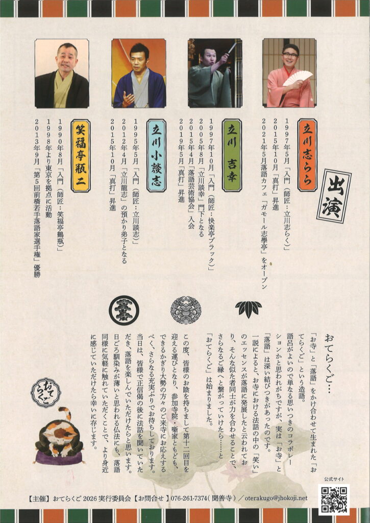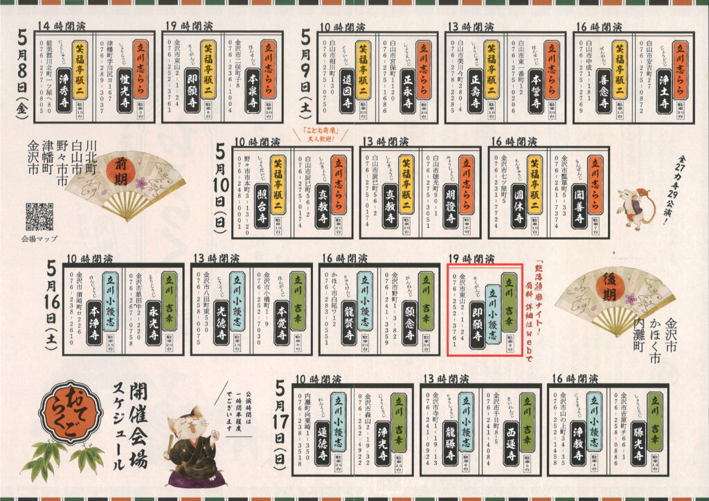 「おてらくご」は令和8年5月9・10・11日、16・17日、金沢市、白山市、野々市市など全27ヶ寺での開催となりますので、お近くの会場にもお寄りください。